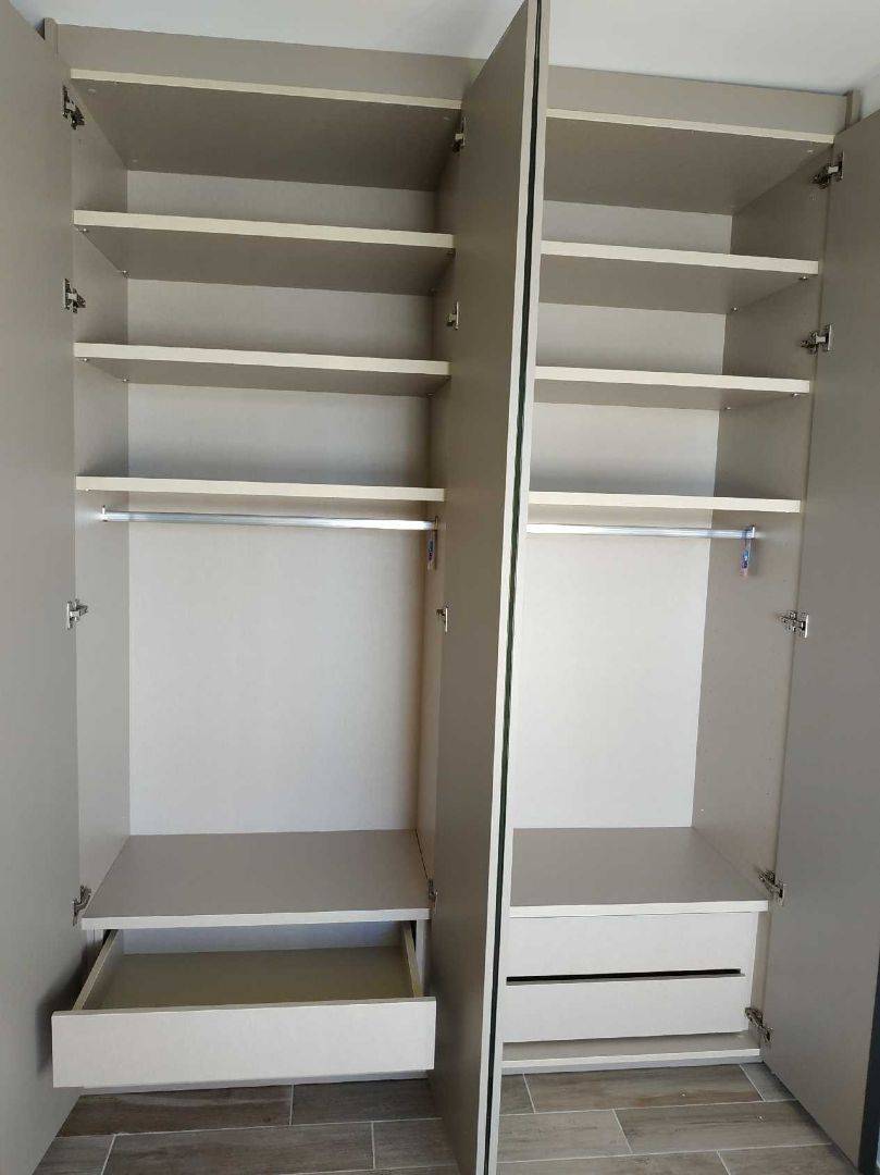Des portes battantes avec des miroirs intégrés, une couleur taupe pour réchauffer la pièce, et des agencements intérieurs pensés pour lui avec penderies, étagères et tiroirs.