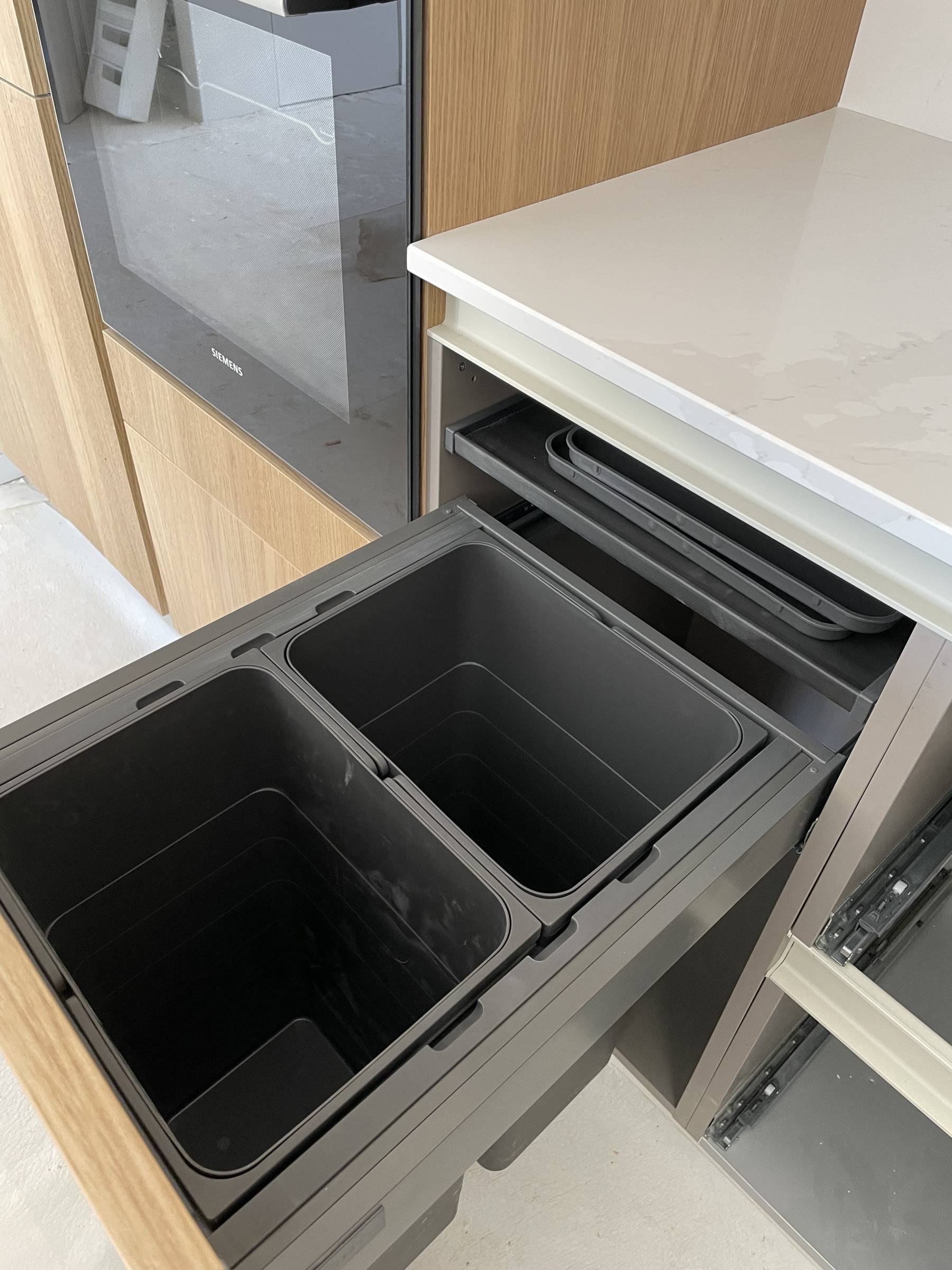 Toujours dans les accessoires, nous avons implanté une poubelle intégrée avec 2 sceaux avec couvercles, permettant de ne pas mettre une poubelle au milieu de l’espace, et ainsi garder l’esprit haut de gamme de cette cuisine bois.