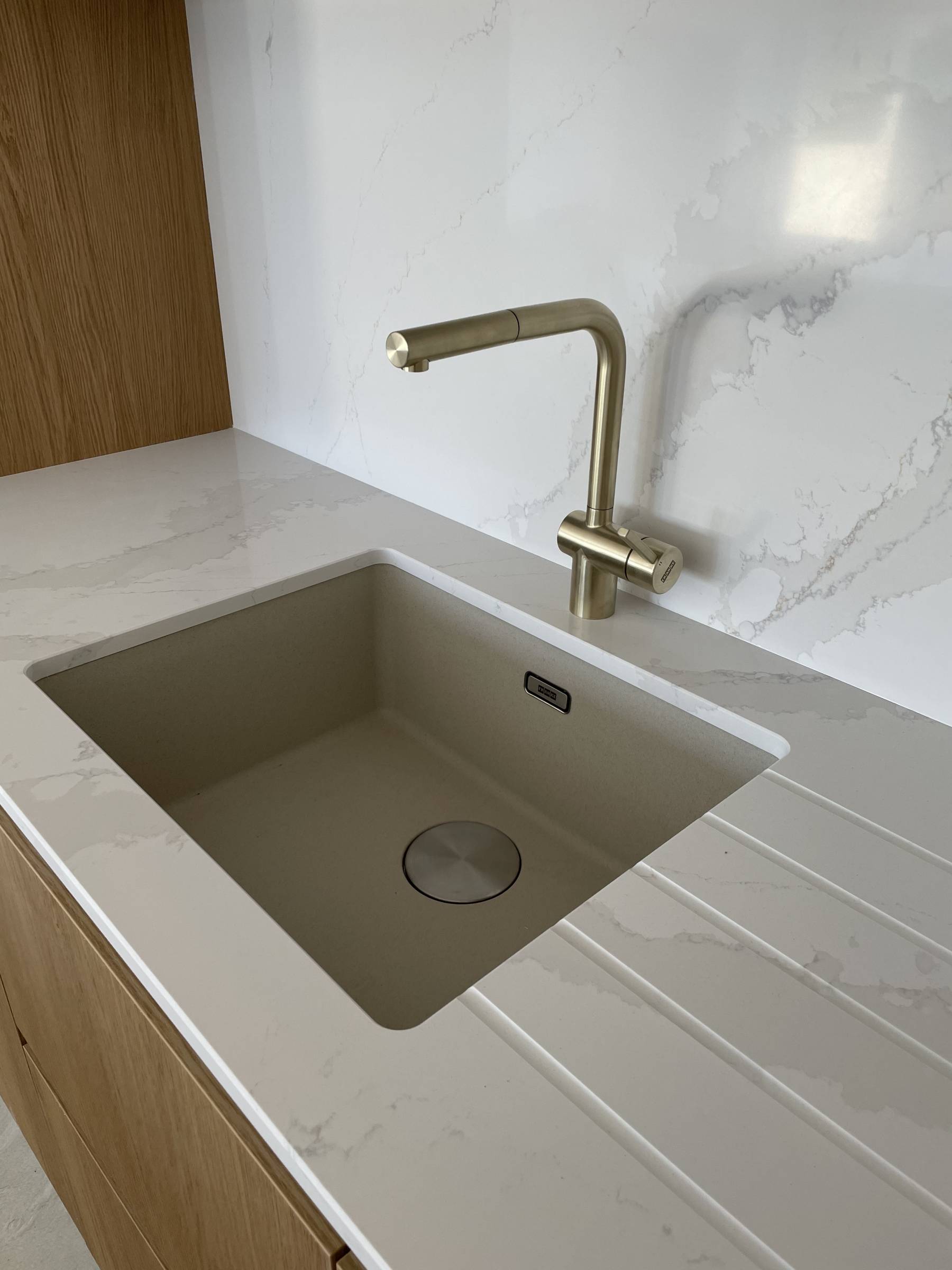 Dans cette cuisine bois, nous avons également joué sur les accessoires, notamment le robinet que nous avons installé, de couleur « Champagne ».