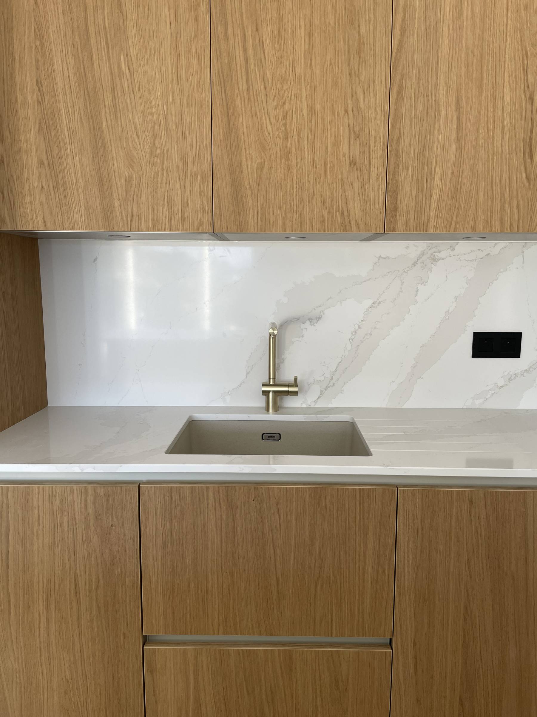 Nous avons également réalisé une crédence toute hauteur, afin de protéger le mur mais aussi donner une dimension haut de gamme à cette cuisine bois.