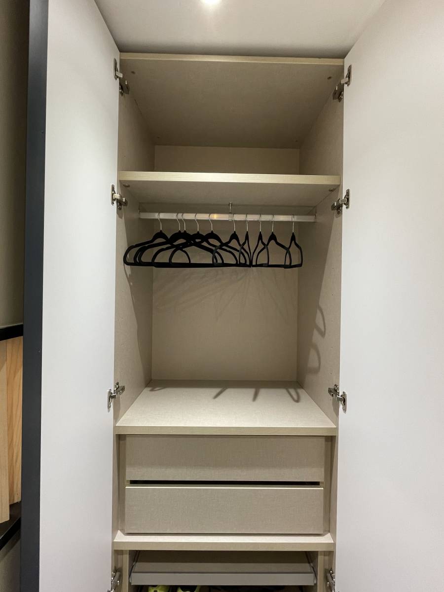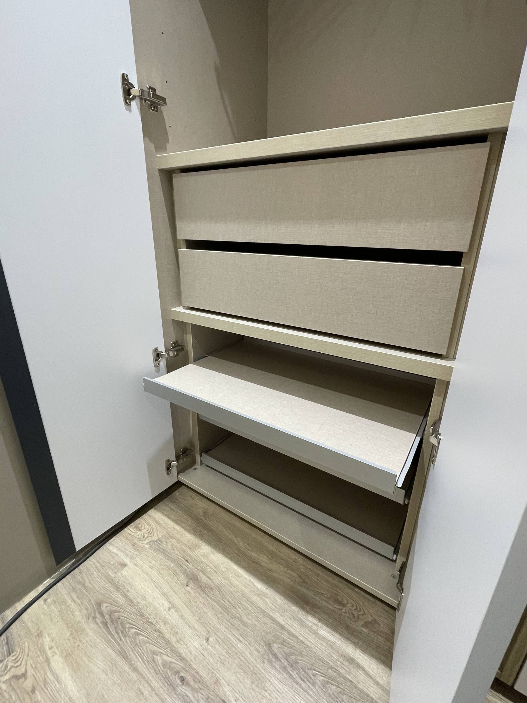 La volonté de nos clients était d'aménager un placard sur mesure dans un petit espace atypique afin de créer un rangement moderne et design.