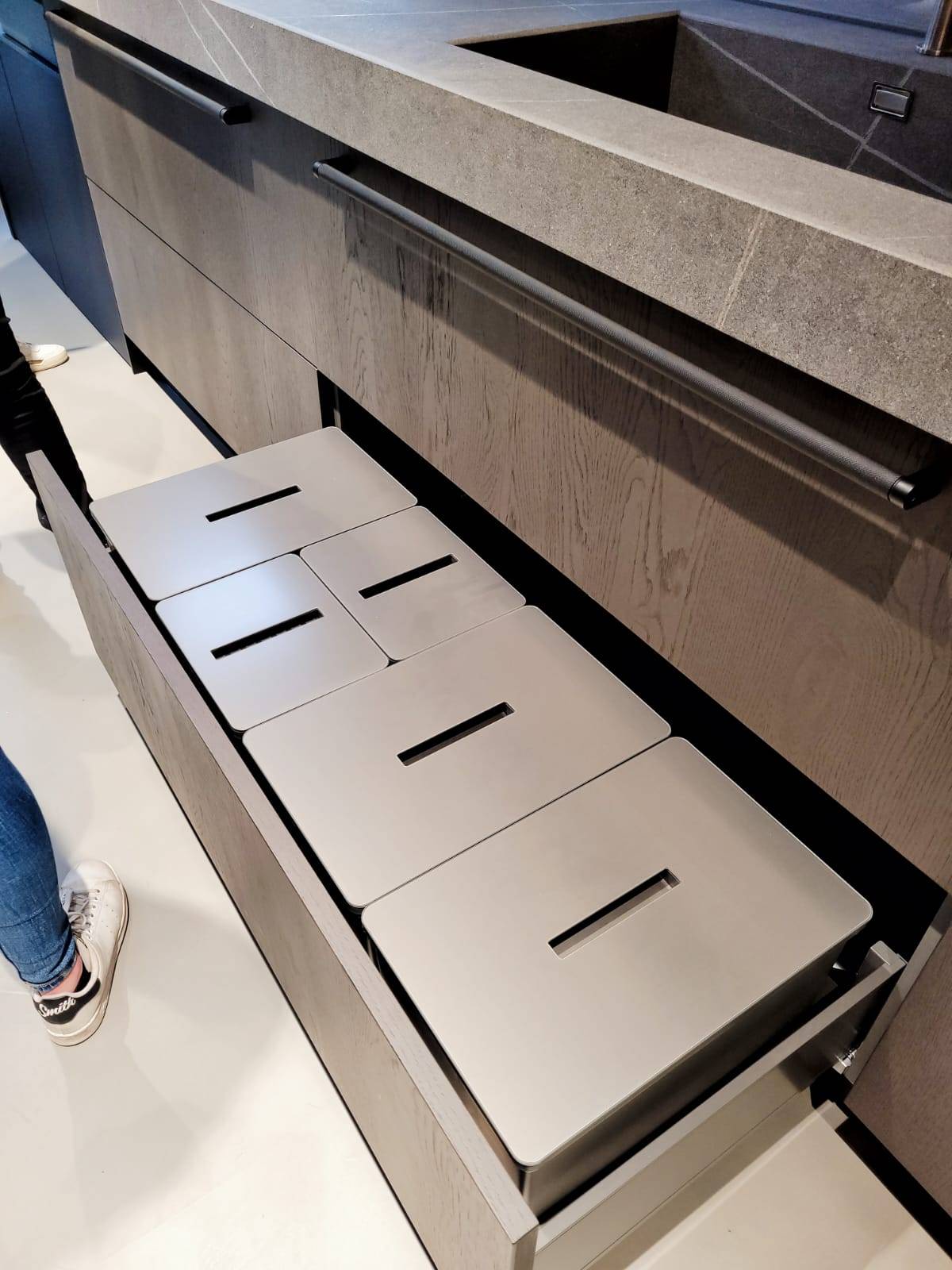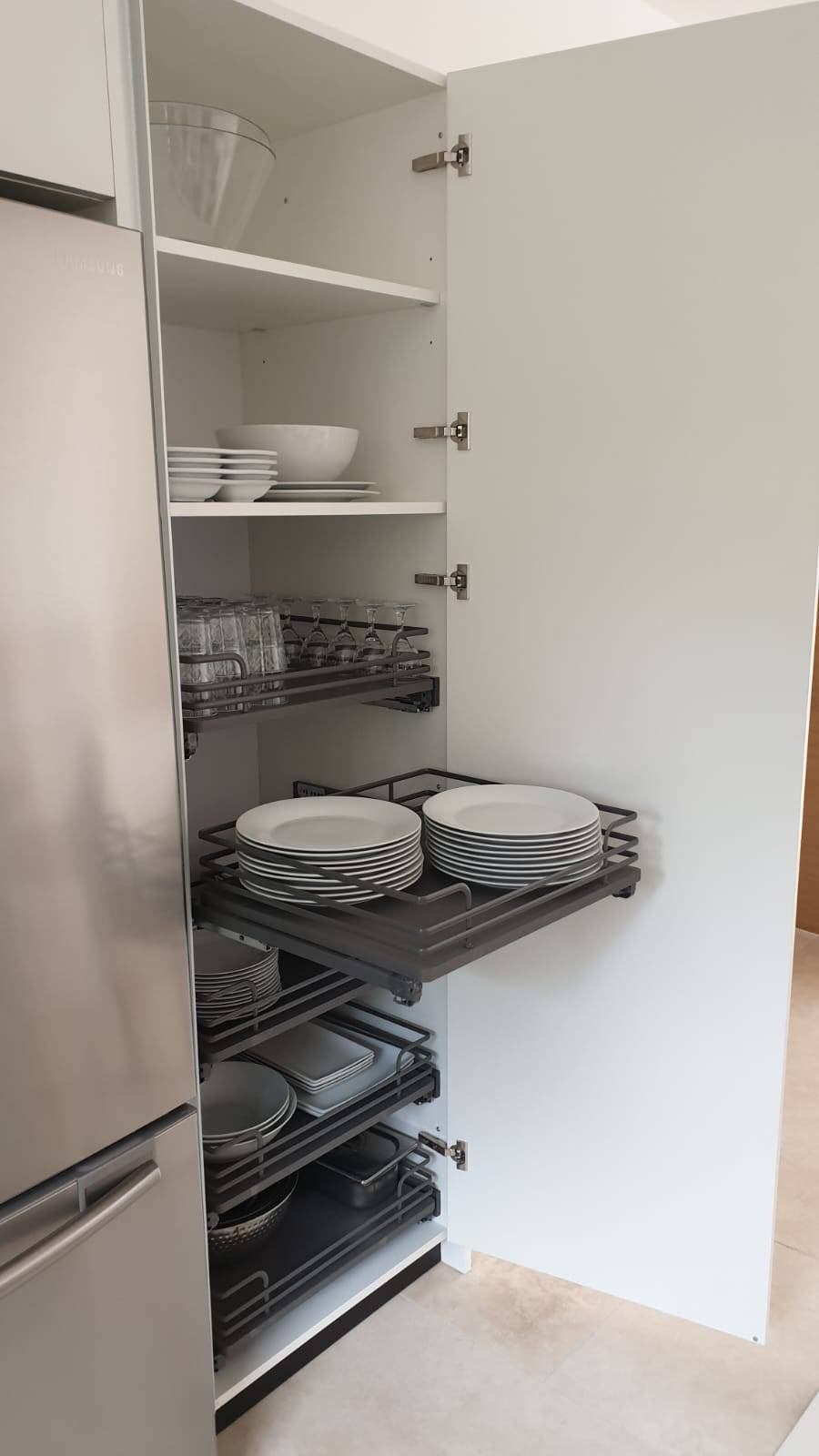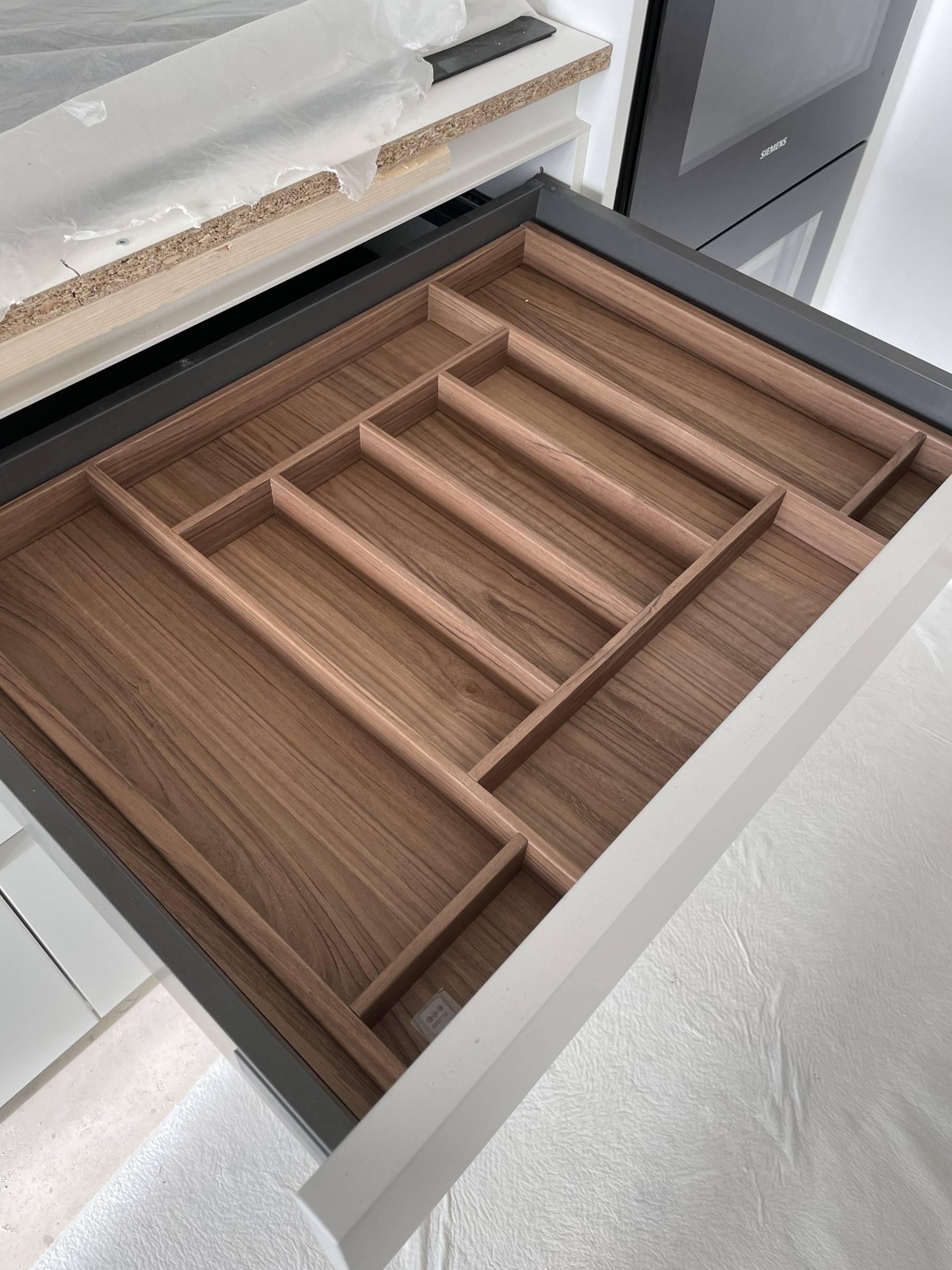 On peut ajouter des éléments intérieurs comme des ranges couverts en inox ou en bois massif, des belles poubelles rangées dans les casseroliers, des tiroirs à l'intérieur de colonnes, des remontées en verre...